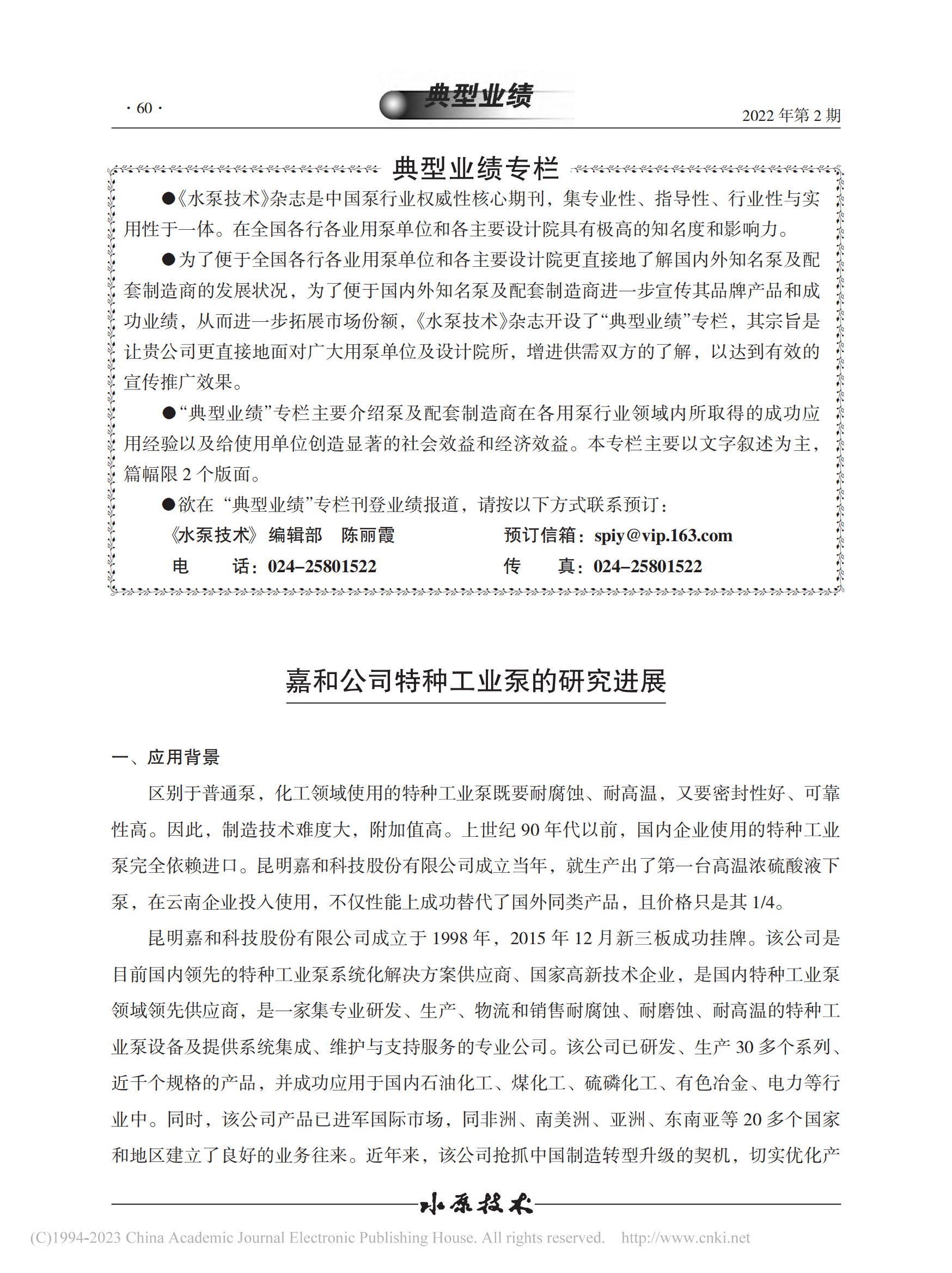 嘉和公司特種工業(yè)泵的研究進(jìn)展